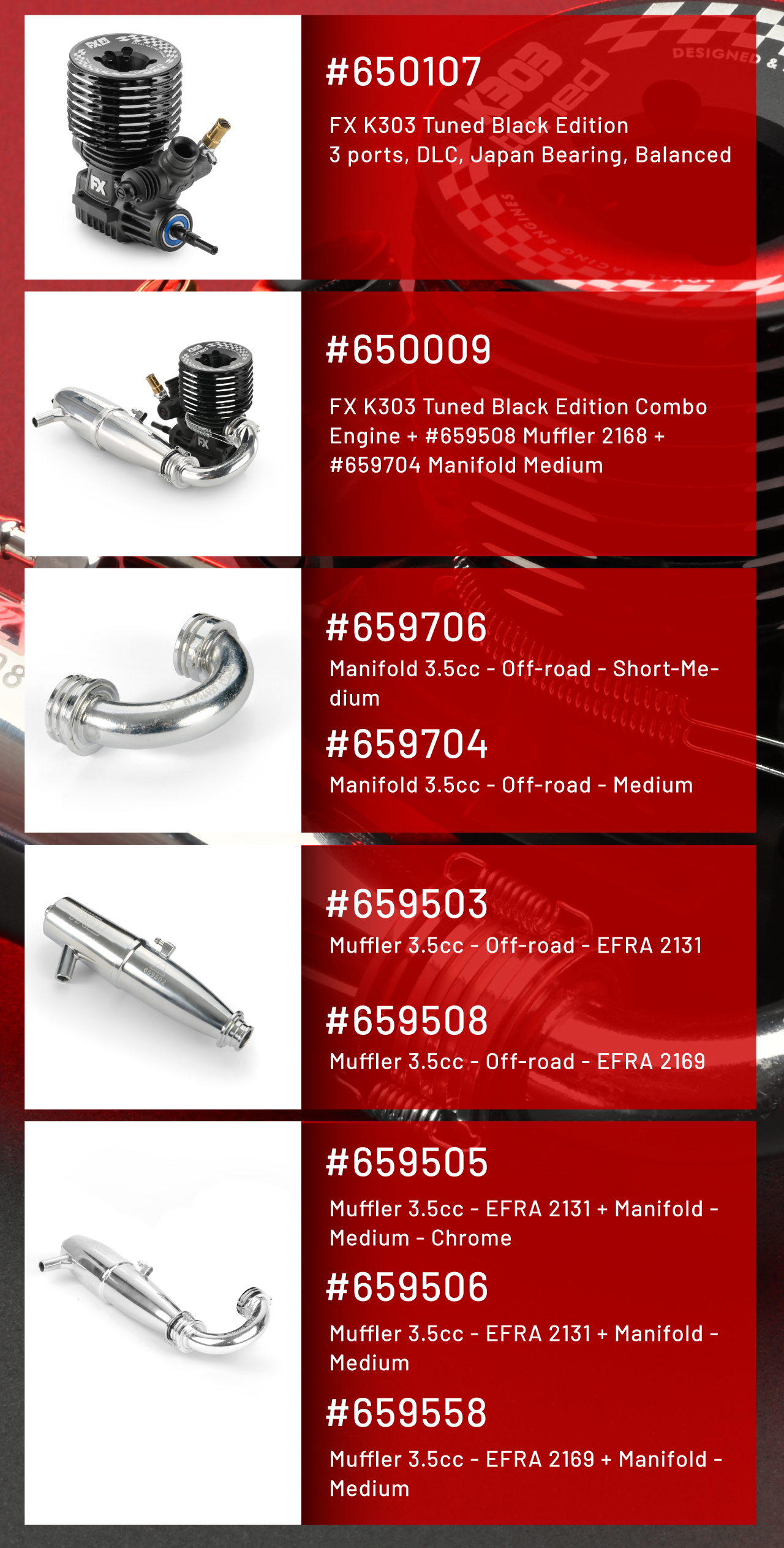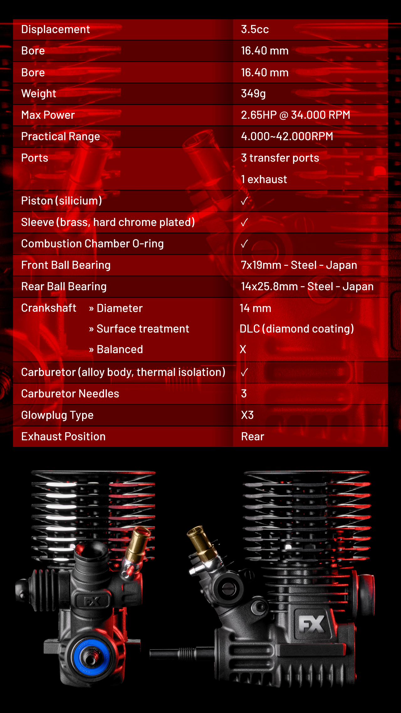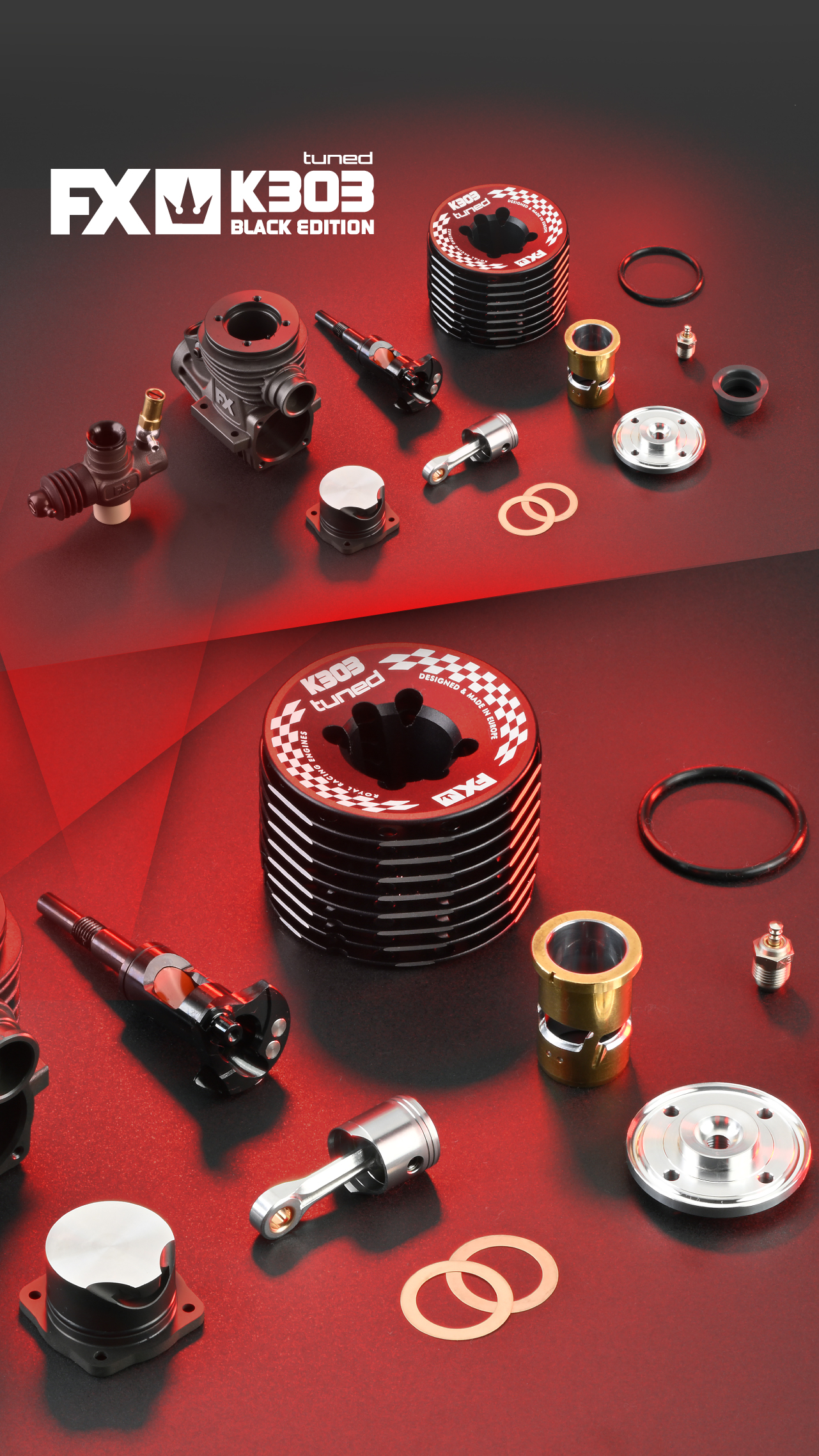 Each K303 Tuned engine includes the FX X3 glow plug, optimized for reliable ignition and stable combustion.