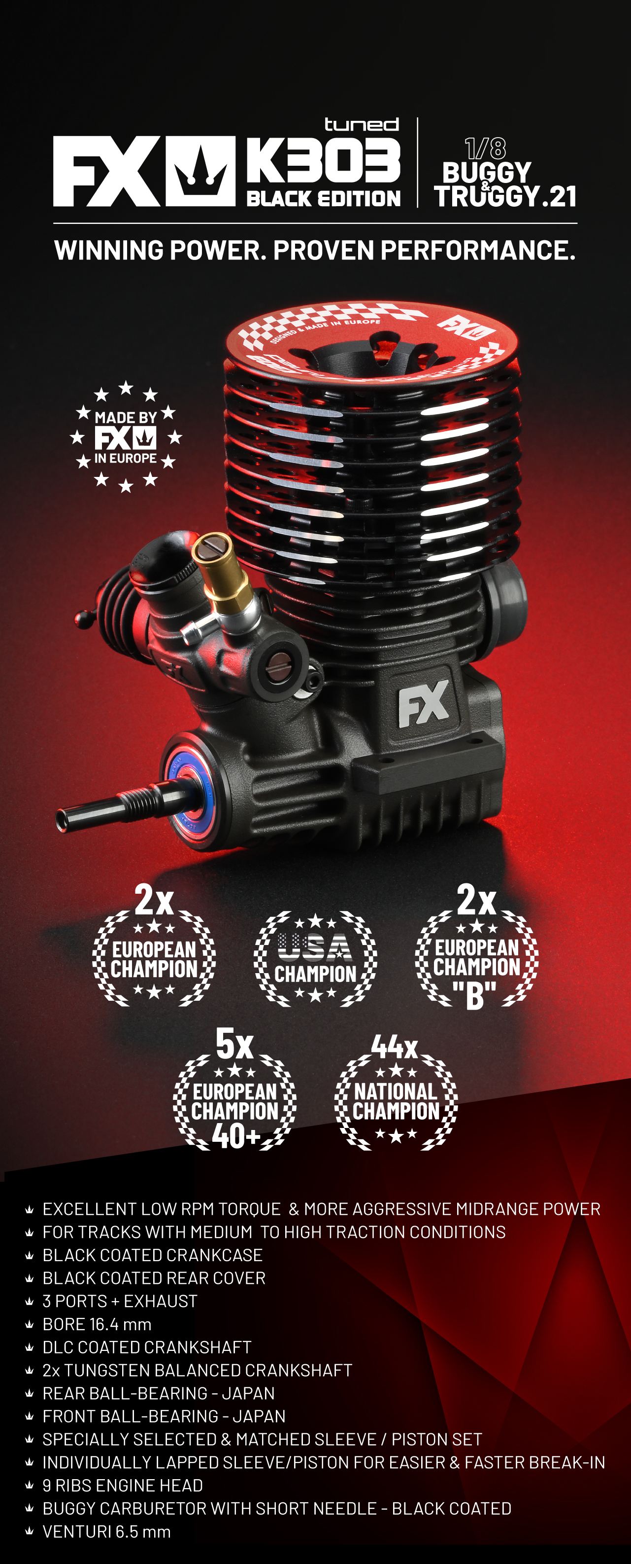 The FX K303 Tuned is a high-performance .21 competition engine designed for 1/8 buggy and truggy racing. It delivers strong power from low-end torque all the way to high RPM, while remaining highly controllable and easy to handle. This allows for precise power delivery and maximum control on a wide variety of track conditions.